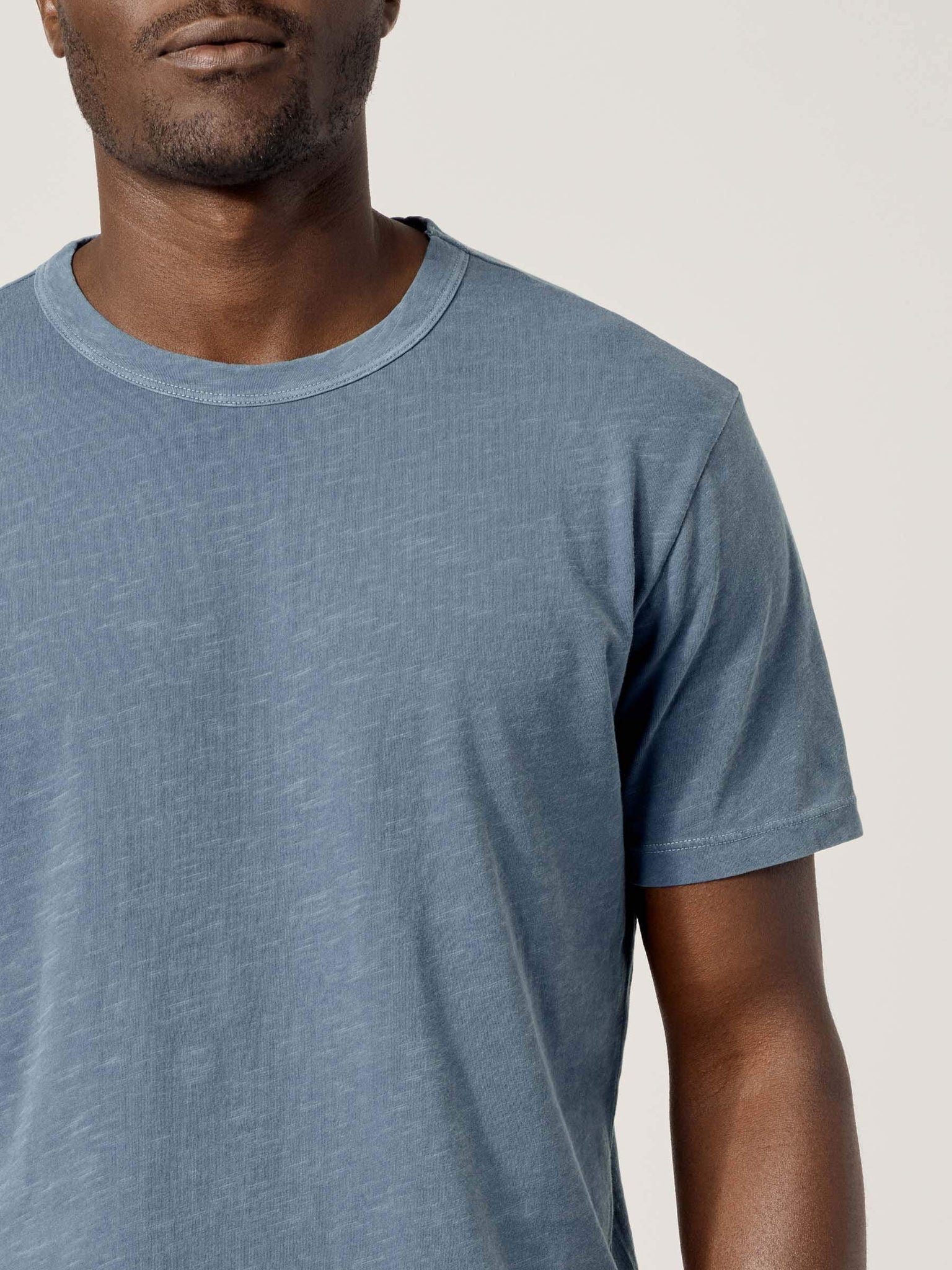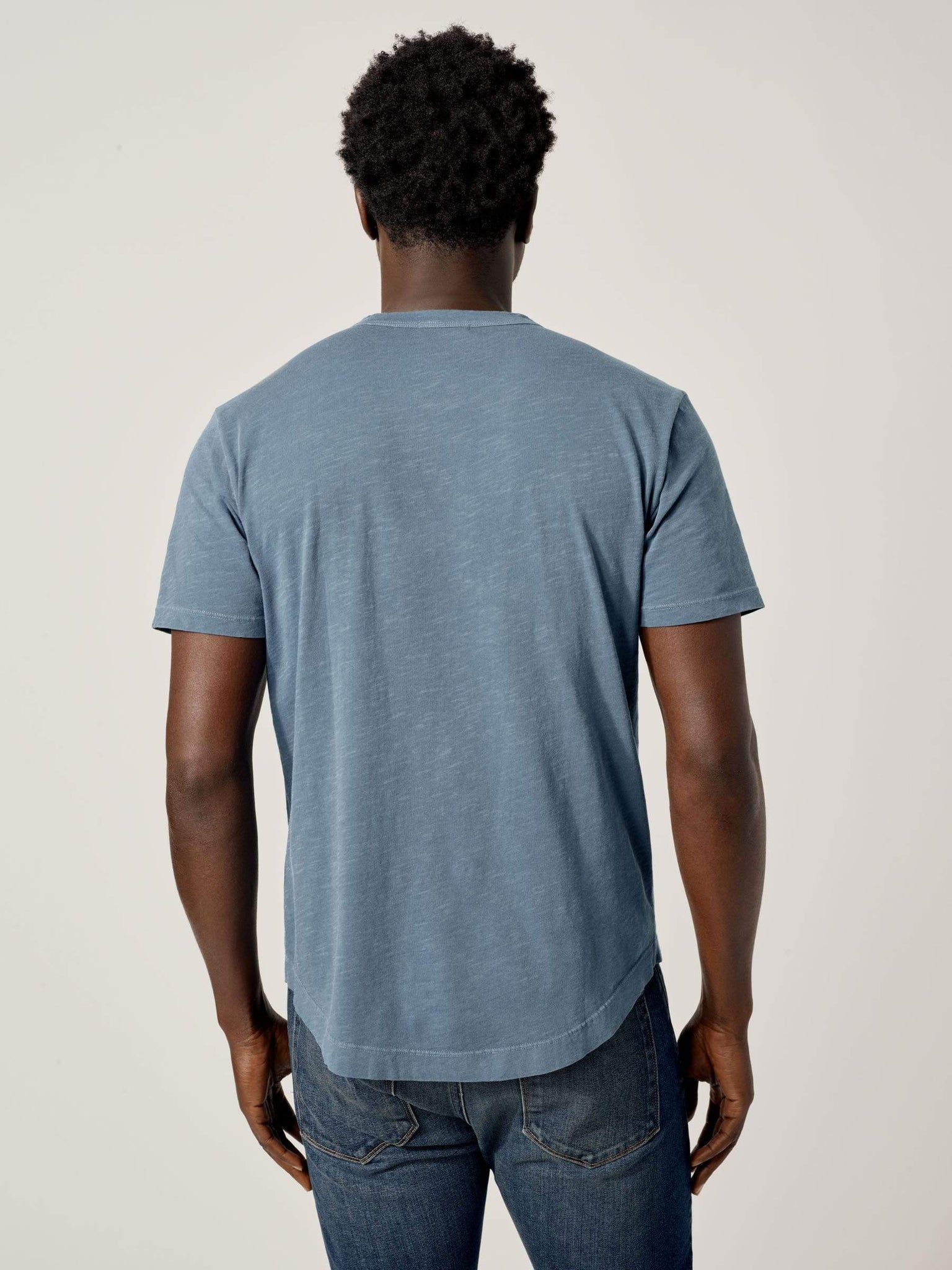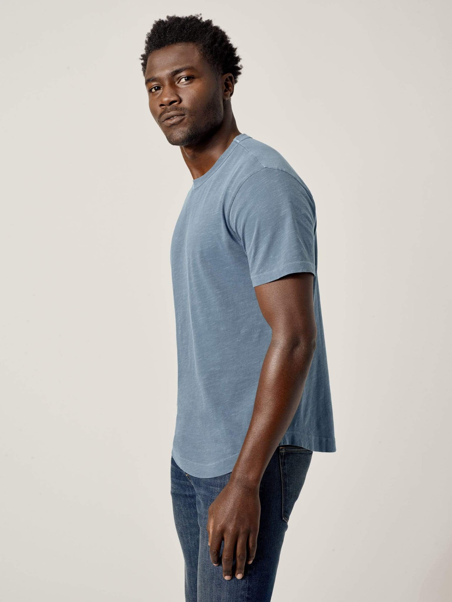 Our slub curved hem tee is built from beautiful 100% slub cotton. Slub is a lightly textured fabric made on small batch, low-tension looms. The neck opening leaves room to breathe, while the rounded shirttail lends a tailored look to an everyday essential.